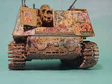 Für die Tarnbemalung habe ich kein Vorbild-Foto eines Nashorn gefunden, wollte es aber einfach mal probieren. Es gibt aber ein entsprechendes Foto einer Hummel und eines Mun-Pz III in Panzerwrecks 4, S. 26/27. Die "Schablonen" bestehen aus Tamiya-Klebeband, das mit einem kreisrunden Stechwerkzeug (Durchmesser 3 mm) bearbeitet wird. So erhält man auch um Ecken und Anbauteile herum saubere Kanten. Die kleinen Kreise wurden mit dem Pinsel aufgetupft.