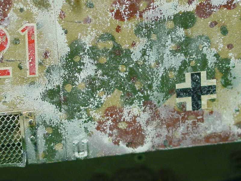 Die abgenutzte Wintertarnung wurde mit der Haarspraymethode aufgebracht. Klappt gut, man sollte allerdings ein paar Probedurchgänge machen, bis man die richtige Trockenzeit und die richtige Methode bzw. das beste "Werkzeug" zum Darstellen der Abnutzung gefunden hat. Falls man - so wie ich - die Tarnung mit Acryl-Farben gespritzt hat, muss man natürlich vorher alles mit Email-Lack versiegeln (ich habe 2 Durchgänge Humbrol Matt gespritzt). Das Haarspray habe ich in einen Deckel gesprüht und dann mit dem Pinsel abschnittsweise aufgetragen. Trockenzeit ca. 5 Minuten. Danach Tamiya Weiß drübernebeln (nicht deckend). Ca. 2 -3 min trocknen lassen. Dann mit einem mit Wasser angefeuchteten Schwamm oder kurzen Pinsel mit harten Borsten erst tupfen, dann vorsichtig streichen, bis der gewünschte Effekt eintritt. Die bearbeitete Stelle mit einem Papiertaschentuch trockentupfen.