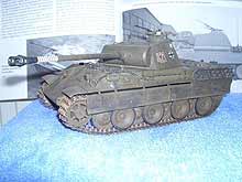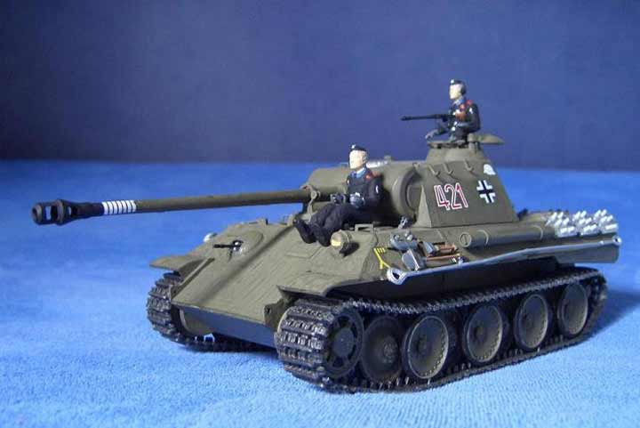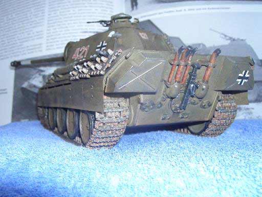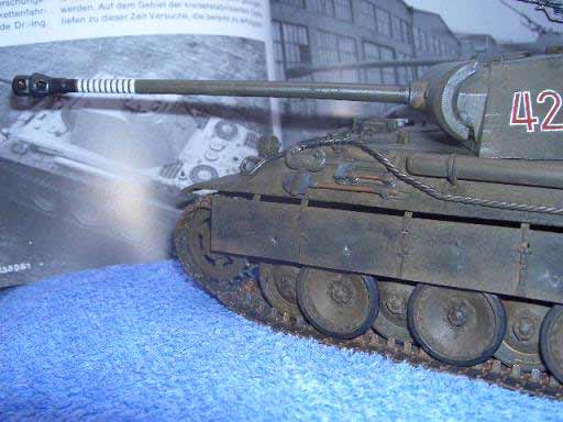 Es handelt sich um einen Panther A. Mein erstes Modell und zugleich erstes mit Washing, Alterung, etc. Zuerst habe ich es einfach out of the Box gebaut ohne Alterung und jegliches. Nur Hauptfarbe und fertig. Nachdem ich die ganzen Alterungsmethoden und andere kennen gelernt hatte entschied ich mich ungefähr 2 Jahre später ihn zu altern. Nach Abschleifen der alten Farbe kam zuerst erstmals eine Grundierung und dann die Hauptfarbe. Und dann die neu erlernten Techniken zur Aufwerten des Modells. Aufgerüstet ist er mit Tamiya Panther Einzelgliederketten und Voyager Ätzteil-Schürzen. Die alten Ketten waren fies und zu dünn und ich fand der Panther müsse Schürzen haben. Vielleicht habe ich als Anfänger ein bisschen zu viel gealtert und gepanscht und es wäre schön von erfahrneren Modellbauern Tipps und Kritik für die Zukunft zu erhalten.