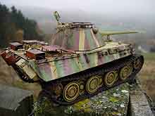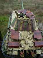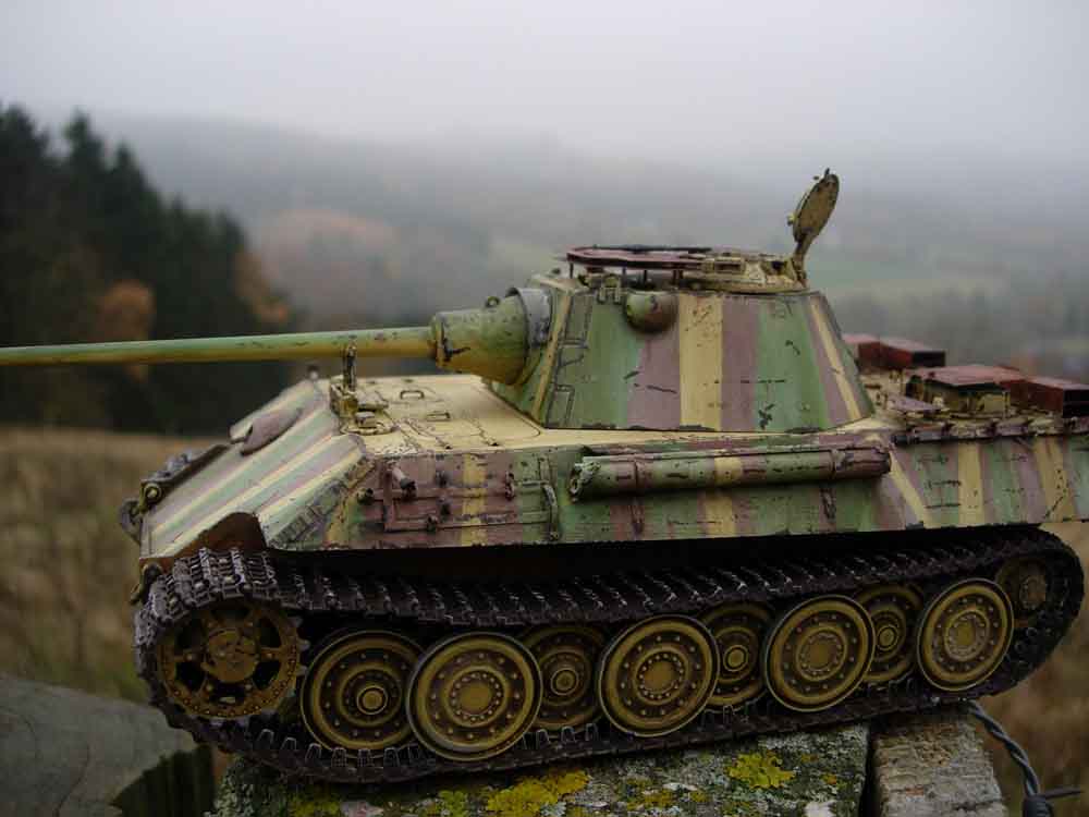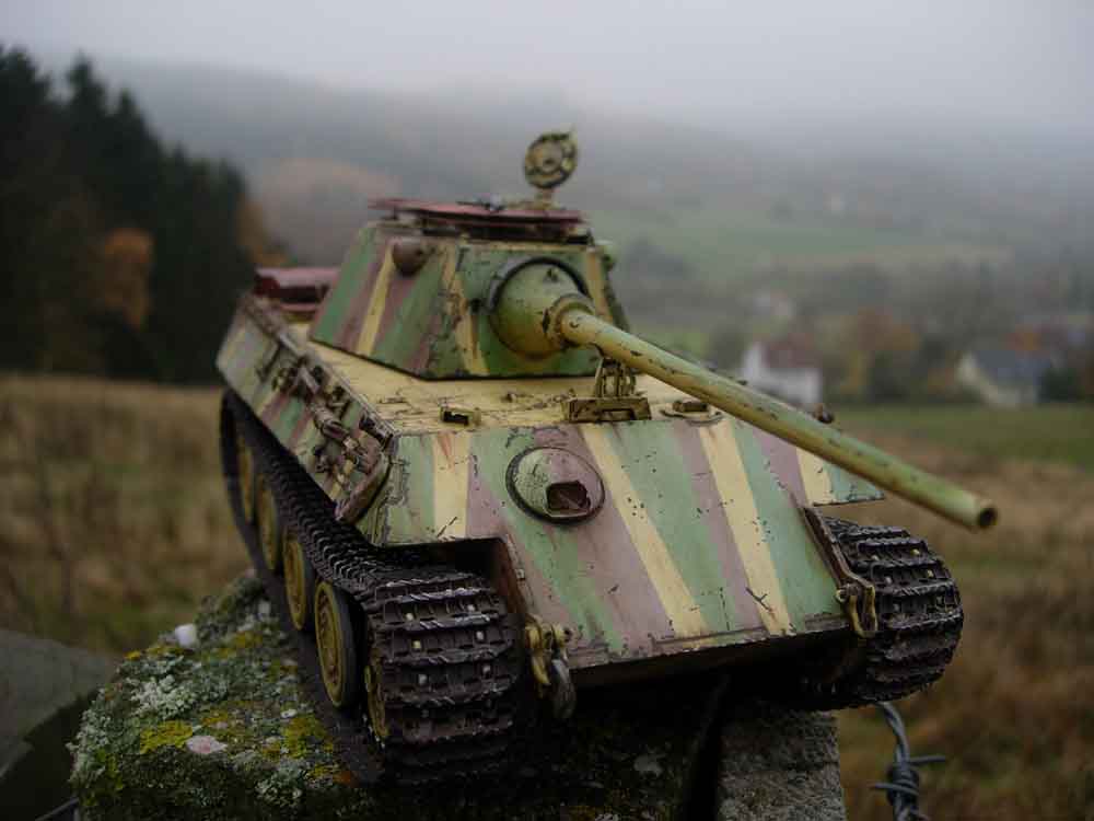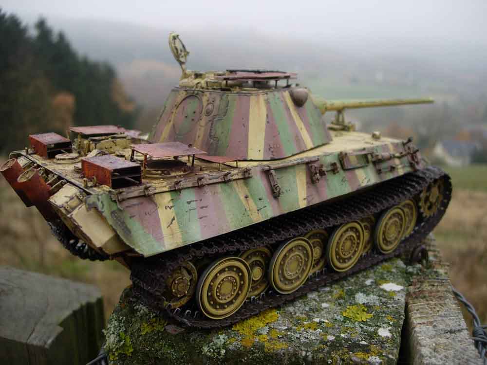 Es handelt sich um den Panther F von Dragon (Smart Kit). So aus dem Kasten gebaut das einzige was zugekauft wurde ist die Zusatzpanzerung von Voyager. Lackiert wurde das Modell mit Tamiya Acryllack, trockengemalt und gewaschen mit Ölfarben von Schmincke, der Abschlußlack ist Gunze H20. Die Rosteffekte wurden mit verschiedenen Pigmenten von MIG dargestellt