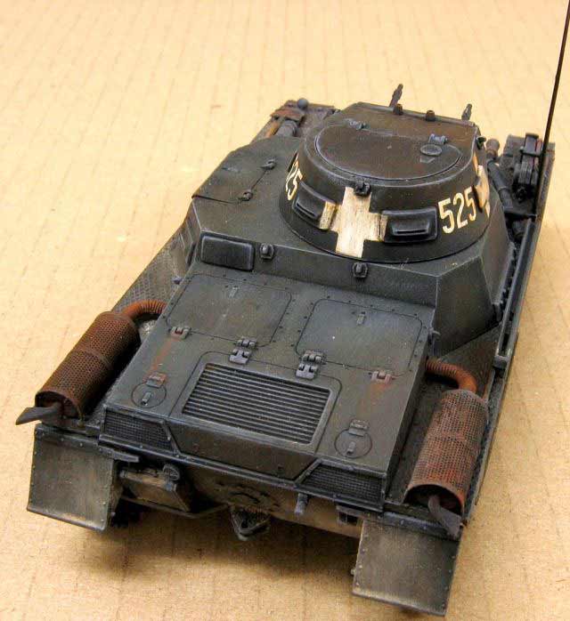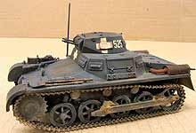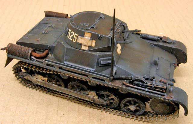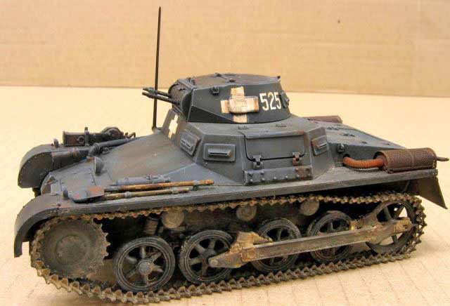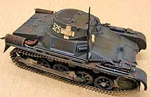 Zu sehen ist Panzer I Ausf.A vom Polenfeldzug (Kit von Tristar). Gebaut wurde Out-of-the-Box. Bemalung nach meinem Schema: hellgrau grundiert, schwarzes Preshading (beides mit Airbrush und Farben von Tamiya bzw. Gunze). Grundanstrich mit abgedunkeltem Tamiya-Panzergrau, mit (kaum sichtbaren) schokoladebraunen Flecken. Gealtert mit Oelfarben (Washing, Filtering, Trockenmalen). Eingestaubt mit Pigmenten von Mig. Zwischen den Arbeitsschritten versiegelt mit Gunze Metal Primer.