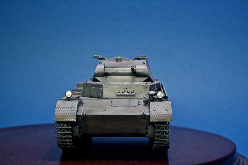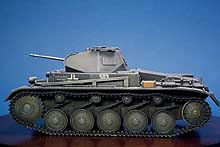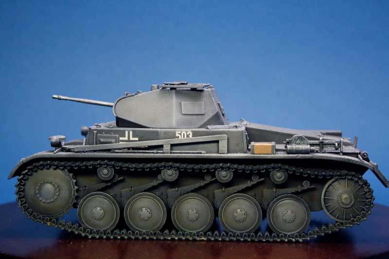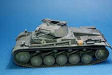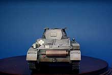 Bei dem Modell handelt es sich um den Tamiya-Bausatz Panzerkampfwagen - II Ausf. A/B/C (Sd.Kfz.121) im Maßstab 1:35. Gebaut wurde das Modell out of the box ohne Ätzteile oder sonstigen Schnickschnack. Nach dem problemlosen Zusammenbau, der, Tamiya sei dank, aufgrund der Passgenauigkeit und Detaillierung sehr viel Spaß machte, erfolgte eine Grundierung in hellgrau mittels Tamiya-Primer. Zur Vorschattierung benutzte ich XF-1 (Mattschwarz) der gleichen Firma. Nach der Trocknung erfolgte eine erste Schicht Panzergrau, die ich zu den Kanten hin nicht ganz deckend auftrug. Zum Aufhellen der Flächen mischte ich ein paar Tropfen weiß hinzu. War auch diese Schicht getrocknet, folgte eine dünne Schicht seidenmatter Glanzlack, damit die danach aufgebrachten Abziehbilder nicht so einen silber schimmernden Film bilden (leider nicht ganz gelungen), sowie um das Modell für das Washing zu versiegeln. Das Washing selbst wurde mit stark verdünnter schwarzer Ölfarbe durchgeführt. Danach noch Trockenmalen mit aufgehellter grauen Farbe und hier und da noch leichte Filter in brauner Ölfarbe. Der Auspuff wurde mittels Pigmente rostig dargestellt. Zum Abschluss folgte noch eine Versiegelung mit mattem Klarlack. Mir hat der Bau dieses kleinen aber feinen Modells sehr viel Spaß bereitet und hoffe, das Tamiya weiterhin so gute Modelle liefert. Allerdings wären Alurohr, Einzelgliederketten und ein paar Ätzteile wünschenswert, wie bei den Dragon Modellen inzwischen fast Standard.