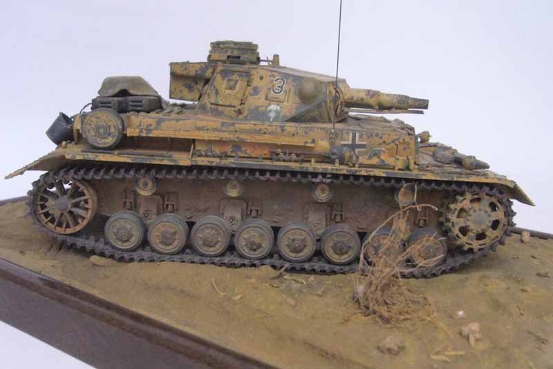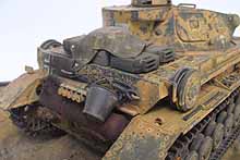 Einzige Nachbesserungen sind das Gepäck, die 12-Uhr Markierung vor der Kommandantenkuppel und kleine Stahlfedern an den klappbaren Kettenschutzenden. Die Antenne wurde wie im Original klappbar gehalten, die Lampen wurden gegen welche aus der Wühlkiste getauscht, die MGs wurden aufgebohrt, die typischen Löcher über den Ketten wurden mit Sheet verschlossen, ansonsten wurde hier schwerpunktmäßig versucht, einen richtig schön verwitterten Afrikaanstrich zu erzeugen, hier realisiert mit Revell-Acryl sowie Lucas-Washing und CMK-Pigmenten. Abgerundet wurde das ganze mit ein paar Zubehörteilen verschiedener Hersteller, sowie einer Gepäckplane aus Miliput.