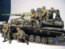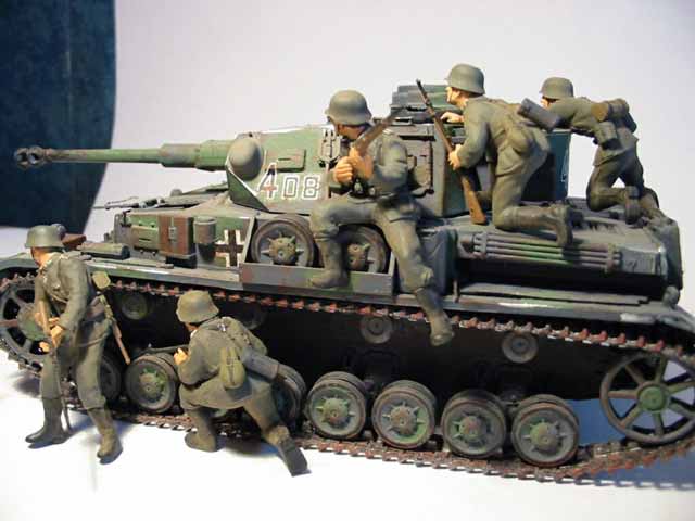 Also der Panzer IV Ausf. F2 ist von Italeri, den Bausatz hab ich vor langer Zeit gebaut, ist komplett aus dem Kasten (wie man sieht), noch mit dem Pinsel bemalt, die aufg. Infantríe stammt von Tamiya und ist etwas neueren Datum´s. Der Panzer wurde gebaut von Ronny Titsch.