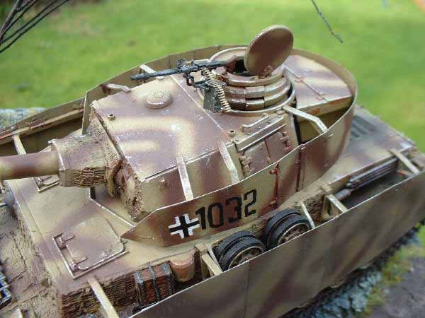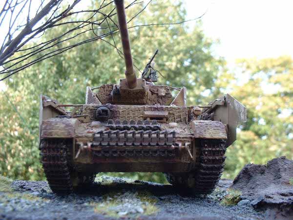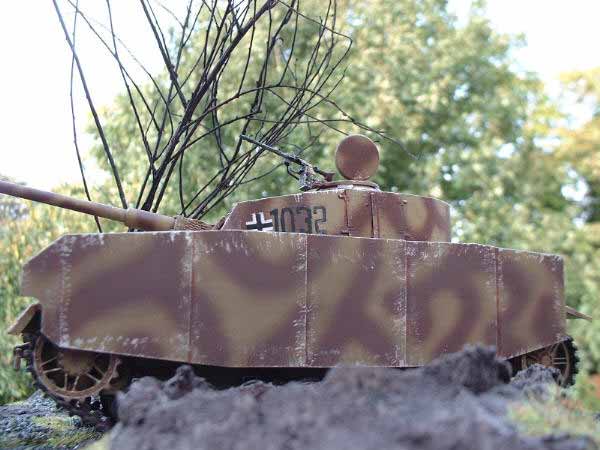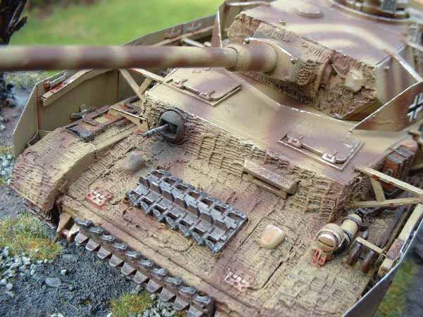 Hier sehen wir den Tamiya Panzer IV Ausf.J von Nik Bird. Das Modell wurde ergänzt durch Eduard Sets und ein Jordi Rubio Rohr. Das Zimmerit wurde mit Miliput-Zweikomponenten Spachtel und Airwaves Zimmerit Tools gemacht. Gespritzt und gealtert mit Tamiya und games-Workshop Farben sowie Pastellkreiden. Passgenauigkeit und Details des bausatzes sind exzellent.