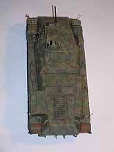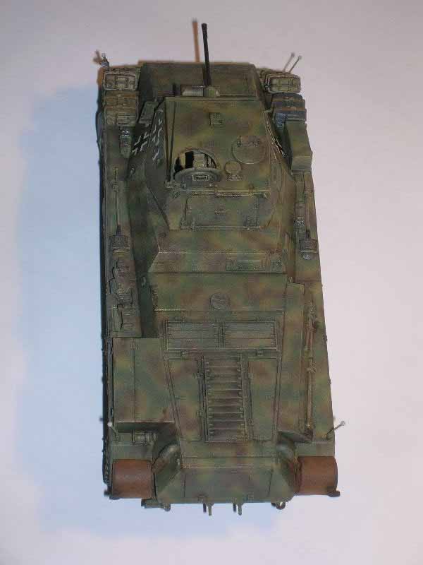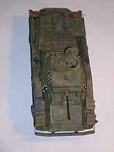 Auf die Montage des Reserverades habe ich verzichtet. Die Bereifung weist unterschied- liches Profil auf, was den damaligen Gegebenheiten entspricht. Die Funkantenne stammt aus dem Sortiment von Schatton-Modellbau. Die Lackierung entspricht der gegen Kriegsende üblichen Dreifarben-Version. Die Alterung nahm ich in der von mir bevorzugten Weise vor.