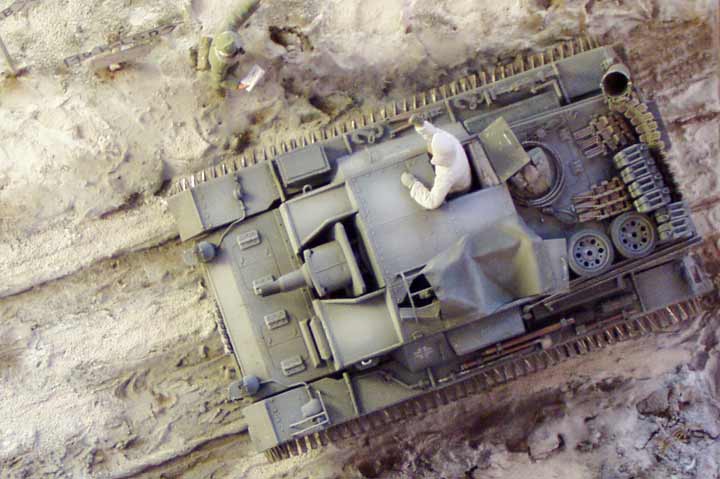 Das StuG ist aus der Box gebaut, einige Kleinigkeiten sind gescratcht wie z.B die Lampenabdeckungen und die Werkzeughalterungen sowie der Metallbügel über dem Periskop. Farben sind von Tamiya (Acryls) und mit einer Aztek versprüht.