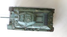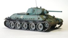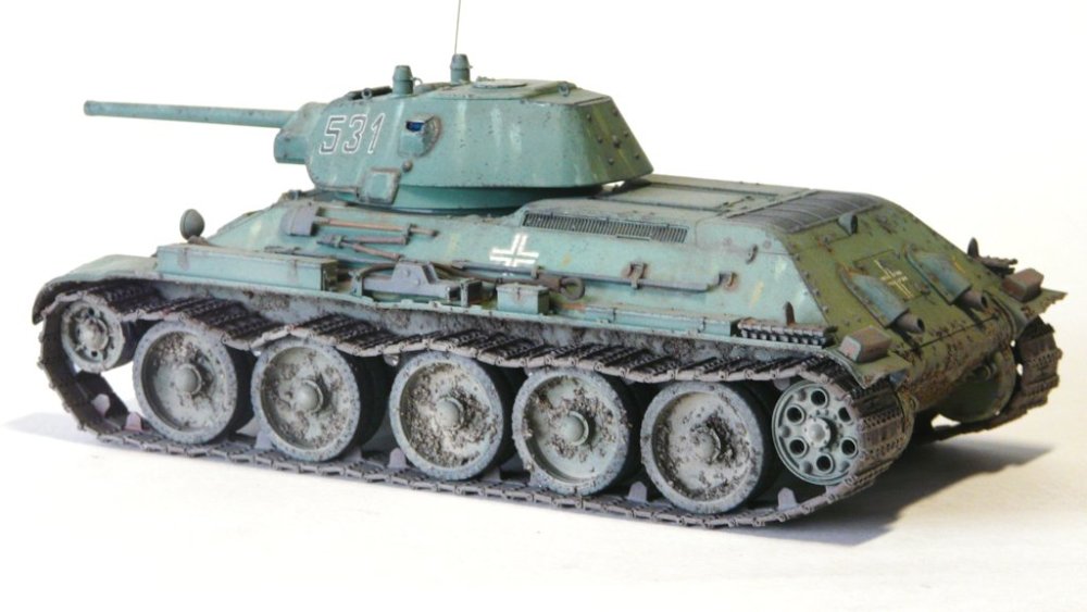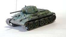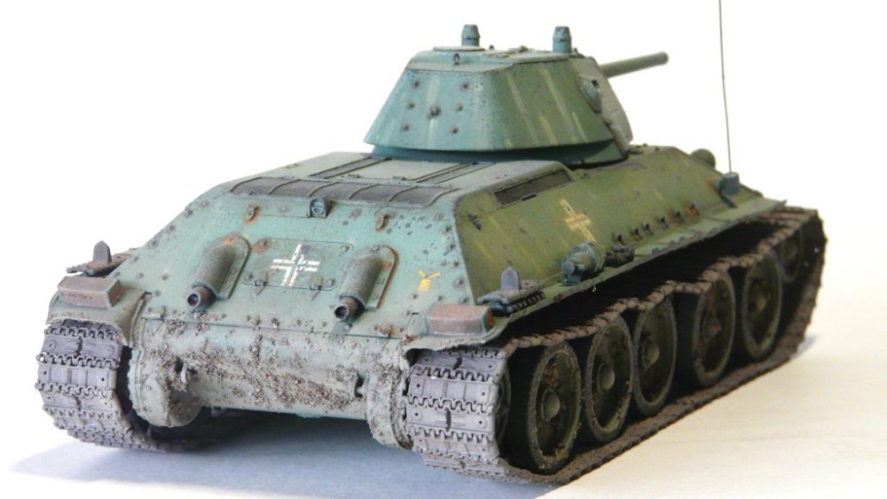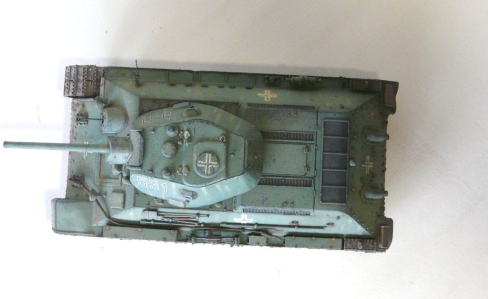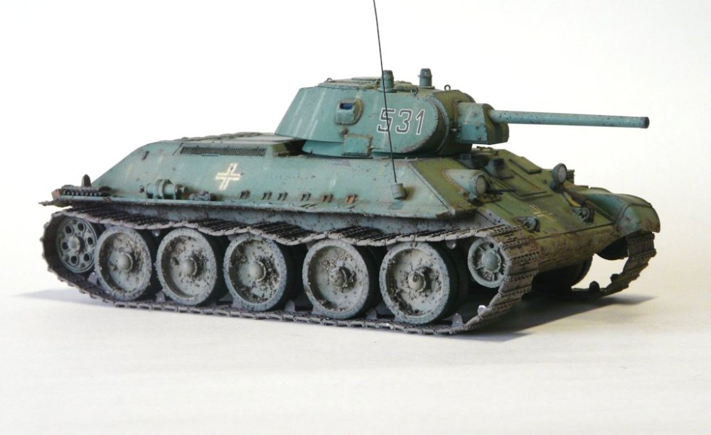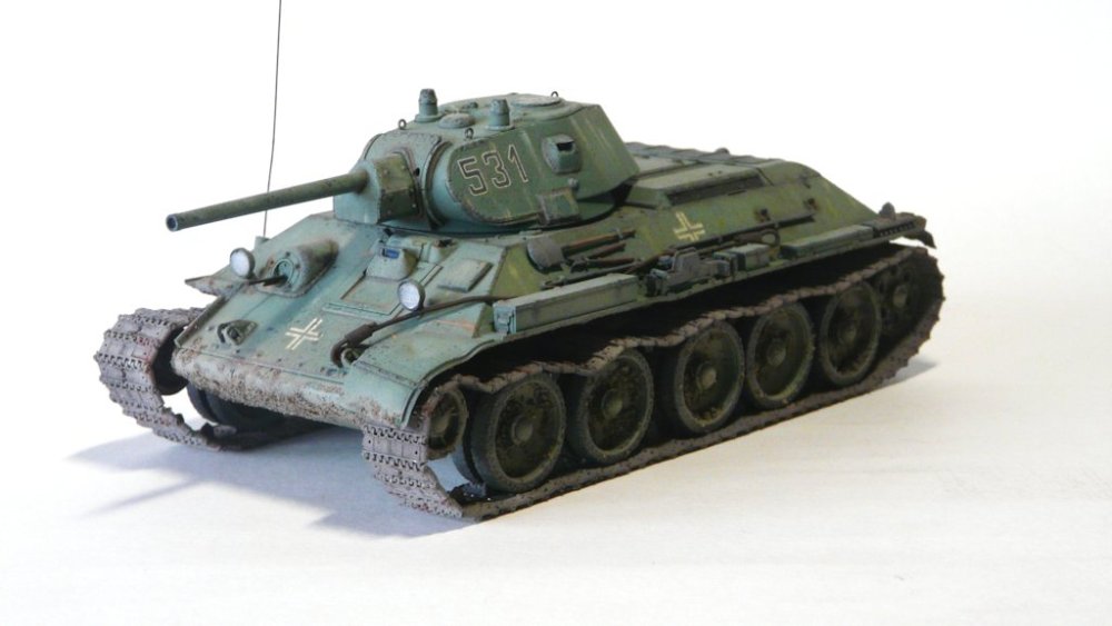 Erbauer: Christian Meyerhoff Dieses Modell entstand mehr aus Zufall denn aus Absicht. Bei einem großen Online- Auktions-Haus ersteigerte ich für kleines Geld das Modell eines T-34, der in den Besitz der Wehrmacht übergegangen war. Zu diesem Zweck wurde er vom Vorbesitzer mit einem panzergrauen Anstrich versehen und am Turm eindeutig gekennzeichnet. Ich habe dann mal im Netz gegoogelt, ob es diesen Panzer so gab, konnte das Fahrzeug aber nicht finden. Auf der Seite von Bison Decals fand ich aber dann das Vorbild für mein Modell. Die Turmnummern und Balkenkreuze lieferte die Restekiste. Zunächst habe ich dann das Laufwerk zerlegt, was problemlos war, da alles nur gesteckt war. Die Ketten konnten mich nicht so überzeugen und wanderten in die Tonne. Nach dem Entfernen der Markierungen wurde das Modell grün lackiert und dann mit den neuen Markierungen versehen. Die Verschmutzungen sind eine Mischung aus Vogelsand, Gartenerde und Kaffeepulver. Die restliche Alterung erfolgte nach den gängigen Methoden. Fehlte nur noch die Kette. Da das ganze Projekt bis dahin sehr günstig war, gönnte ich mir einen Satz Friul-Ketten. Ich muss ehrlich sagen, dass sie am Modell toll aussehen. Nur der Weg dahin war doch sehr aufwendig. So viele Löcher hatte ich selten gebohrt, weder mit dem Handbohrer in die Kettenglieder, noch mit dem störrischen Draht in meine Finger. Viel Spaß mit den Bildern.
