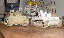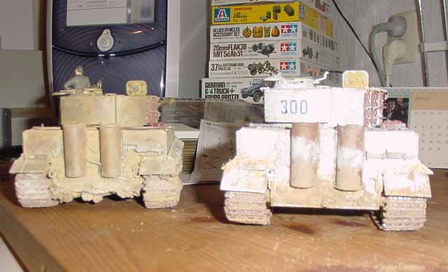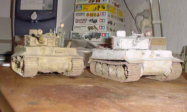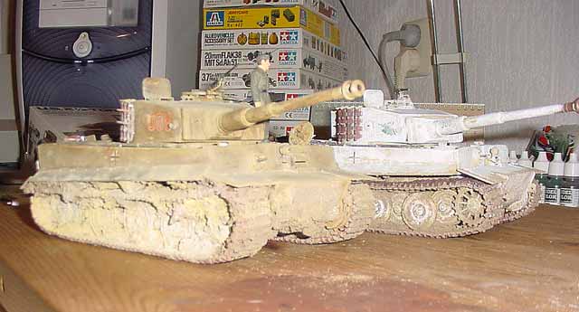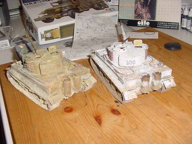 Zwei Modelle von Tigern von Wim Plokkers. Der in Wintertarn ist von Italeri, der andere von Tamiya. Beide haben wohl Fahrten durch schwerstes Gelände gehabt. ;-)