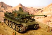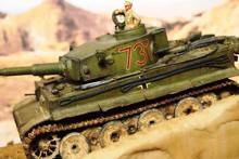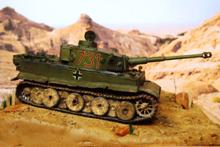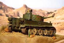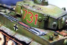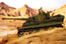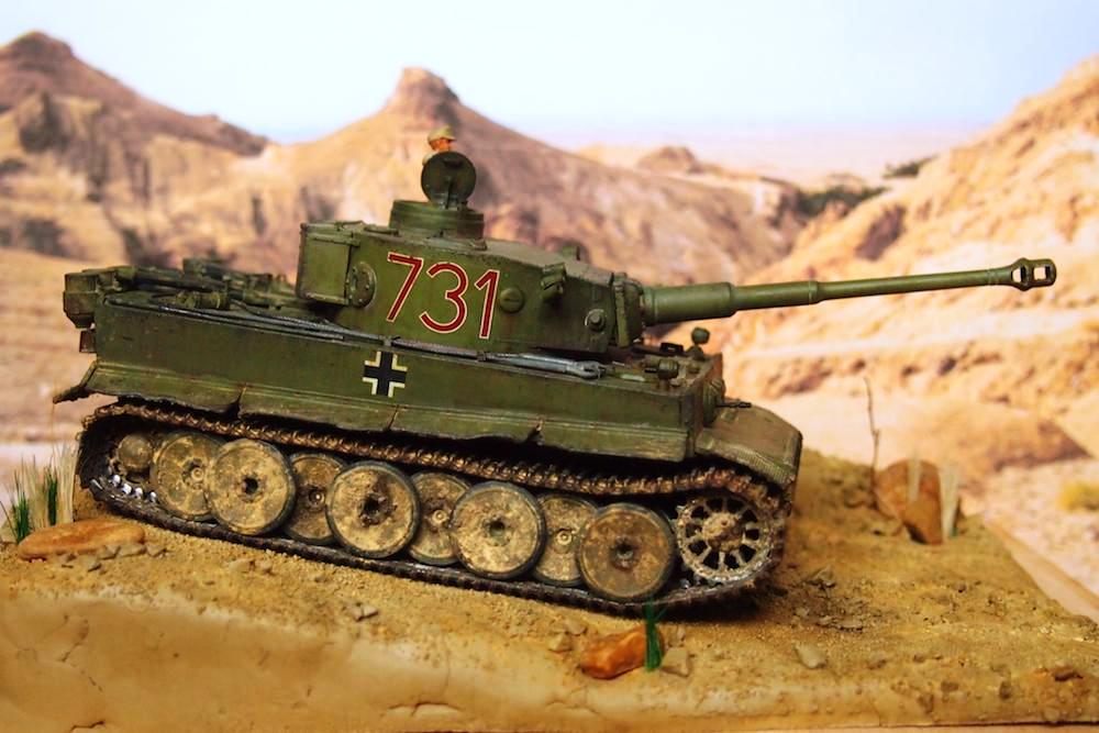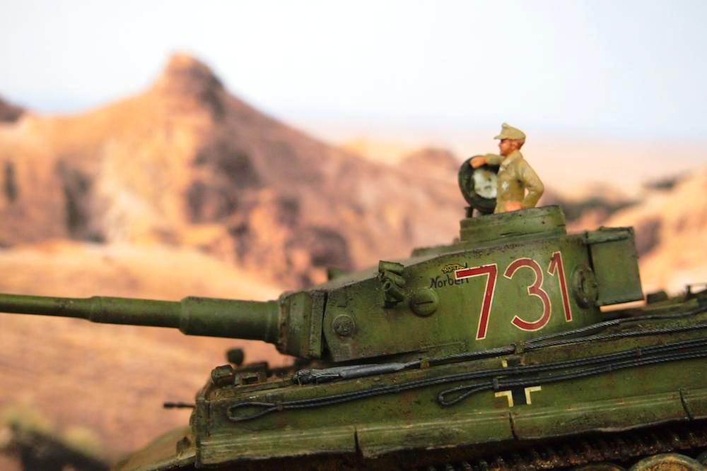 Erbauer: Benedikt Decker Dies ist der Tamiya Bausatz des Tiger 1, Initiale Produktion, DAK in 1:48. Zur zusätzlichen Detaillierung wurden noch Teile aus dem Voyager Model PE Set für dieses Modell, Friul Weissmetalketten sowie die Stahlseile von Eureka XXL verwendet. Die Matschfänger an den Seiten sind nicht aus dem PE Set. Hier habe ich ausprobiert, das Plastik mit Hilfe von vorsichtigem erhitzen zu deformieren. Ich fand das Ergebnis nicht so schlecht. Nach dem Zusammenbau wurde das Modell mit der hellgrauen Tamiya Grundierung aus der Dose grundiert, gefolgt von einer Vorschattierung mit Tamiya XF-85 Rubber Black, mit der Airbrush. Nun wurde die Grundfarbe, eine 50/50 Mischung aus XF-58 + XF-60, wie in der Bauanleitung vorgeschlagen, in mehreren dünnen Schichten aufgetragen. Die horizontal nach oben zeigenden Flächen wurden danach mit Grundfarbe benebelt, die mit ein paar Tropfen weiß aufgehellt wurde. Es folgte noch die Detailbemalung der teilweise angegossenen Werkzeuge. Jetzt wurde auch der Hammer angeklebt, der mit der Schaufel das einzige Werkzeug darstellt, welches man einzeln lackieren kann. Da ich auf einigen Originalfotos gesehen habe, dass die Schaufel nebst deren Befestigungen gänzlich fehlt, habe ich diese weg gelassen. Die Ketten habe ich mit Zinnpatina geschwärzt und dann mit diversen Farbpigmenten gealtert und verdreckt. Hinterher habe ich die Stellen, die ständig an den Laufrollen schaben oder den Boden berühren wieder mit feinem Schleifpapier blank geschliffen. Lackschäden wurden mit einem Abrissstückchen von einem Schwamm aufgetupft. Hier wurde ein schwarzbraun aus XF-1 schwarz und XF-64 rotbraun gemischt. Man fügt dem rotbraun solange tröpfchenweise schwarz zu, bis die Farbe fast schwarz wirkt. Um die Tiefenwirkung noch zu erhöhen habe ich den Valejo Modelwash for green vehicles „Dark Green“ leicht verdünnt in die Gravuren, Stöße, Kanten usw. laufen lassen. Nach kurzem antrocknen kann man den Wash gut mit einem leicht wasserfeuchten Pinsel mit der Umgebung verblenden. Rostläufer habe ich mit einem AK Produkt erzeugt. Man braucht das Produkt eigentlich nicht, da man es ganz einfach mit Ölfarben und Terpentin selber herstellen kann. Aber ich wollte es mal ausprobieren und wissen, wie es zusammengesetzt ist. Matsch und Dreckspritzer auf dem Panzer und den Laufrollen wurden mit Acrylic Resin erstellt, welches mit Acrylfarben und Staub und Sand gemischt wurde. Die letzten Arbeiten waren mehrere Staub-Sessions. Hierzu habe ich Farbpigmente teils trocken aufgetragen und dann mit Pigmentfixierer fixiert, teils auch Farbpigmente mit Terpentin gemischt und dann auf das Modell aufgetragen. So verlaufen sie schön zufällig. Letztlich habe alles leicht mit mattem Klarlack übernebelt.