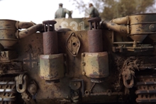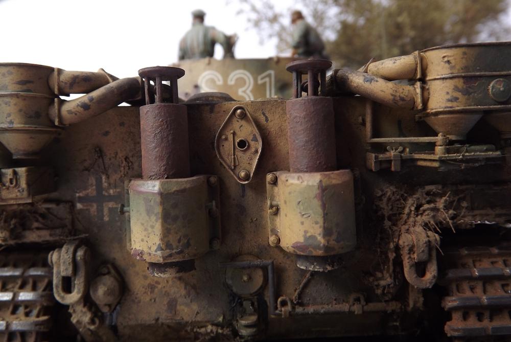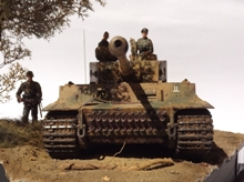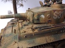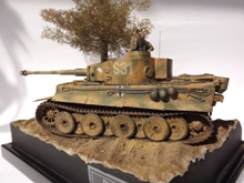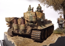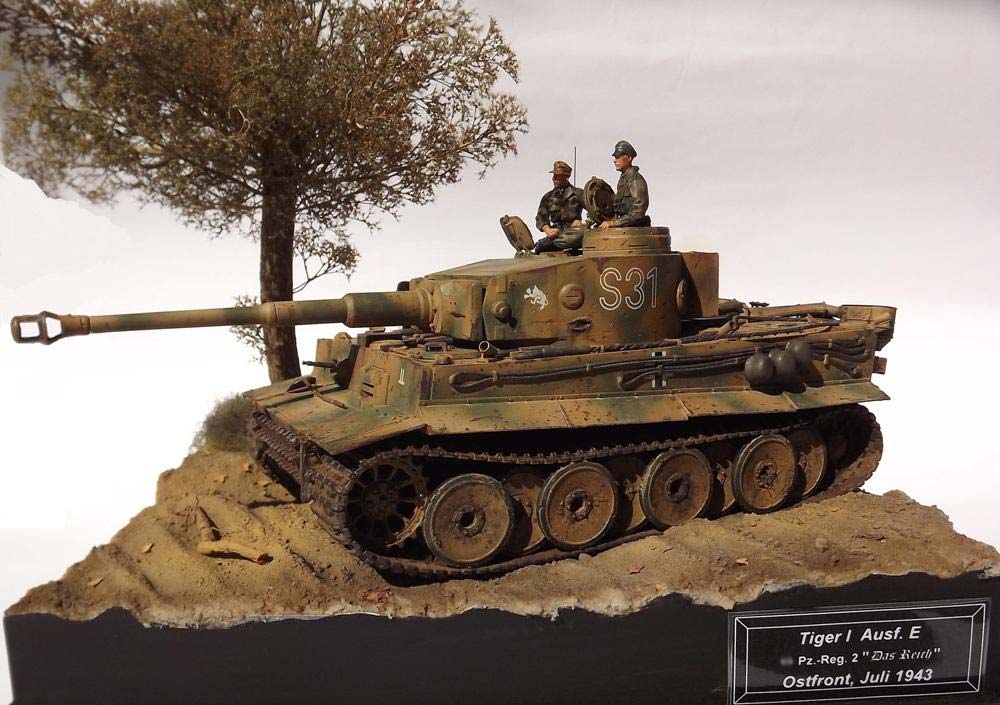 Erbauer: Tobias Wehnert Zubehör: Alu-Rohr von Jordi Rubio Der Tiger TAMIYA #35216 ist mein absoluter Lieblingsbausatz, schön detailliert, absolut maßhaltig und trotzdem mit überschaubarer Teilezahl, damit kann man früher mit der Lackierung beginnen. Nicht mein erster 35216 und sicher auch nicht der letzte. Die Schleppseile sind aus gedrehtem Draht, ergänzt wurden noch die Scheinwerfersockel mit Kabeln sowie Hebepilze an den Auspuffabdeckungen. Antenne wie üblich aus optischer Faser. Es wurden etliche Beschußschäden am gesamten Fahrzeug entsprechend vieler zeitgenössicher Bilder dargestellt, die Verschmutzung aus Staticgras, Holzleim, Quarzsand und Pigmenten wurde bereits vor der Lackierung aufgebracht. Darüber hinaus wurde besonderes Augenmerk auf die Struktur der Panzerung gelegt, welche mit diversen Fräsen und Mr. Surfacer deutlich verstärkt wurde. Die Lackierung erfolgte mit Revell Acryl, die Beschussschäden wurden mit Rot vorlackiert und mit Maskol abgedeckt. Dann wurde eine Tarnung Olivgrün auf Sandgelb aufgebracht. Die Decals wurden teils dem Bausatz entnommen, vor allem der Troll der schweren Abteilung von „Das Reich“ ist sehr schön gedruckt. Lediglich die Nummer 31 wurde aus dem Fundus ergänzt, da ich unbedingt den Wagen von Untersturmführer Alois Kalls im Sommer 1943 nachbilden wollte. Gealtert wurde dann mit diversen Washings, sowohl Fertigprodukte von AK und Mig als auch selbst gemachte Ölfarbwashings fanden Anwendung. Verdreckt wurde dann überwiegend mit AK Dark Mud, Fresh Mud und Earth Effects sowie div. Pigmenten die mit Pigment Binder von Vallejo dauerhaft fixiert wurden. Metalleffekte wurden mit einem 2B Bleistift und geriebenem Graphit realisiert. Die Figuren sind von Dragon und Alpine und wurden ebenfalls mit Revell Acryl bemalt, lediglich die Hautflächen wurden mit Citadelfarben gestaltet.