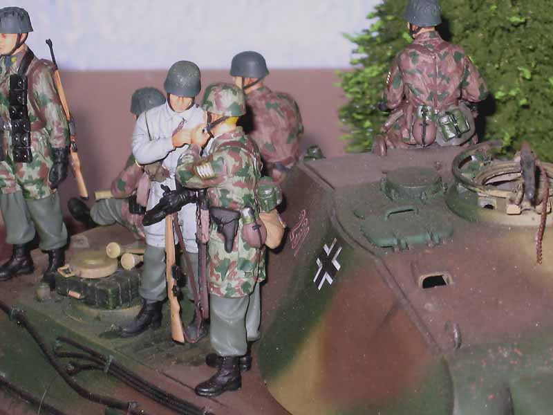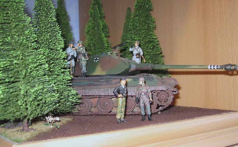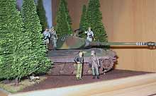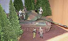 Der "Königstiger "ist das alte Tamiya-Modell. Die Fallschirmjäger-Figuren stammen von Dragon und der Panzermann von Tamiya. Die Bäume kommen aus dem Eisenbahnzubehör, ein bisschen Sand und Streugras...und fertig.