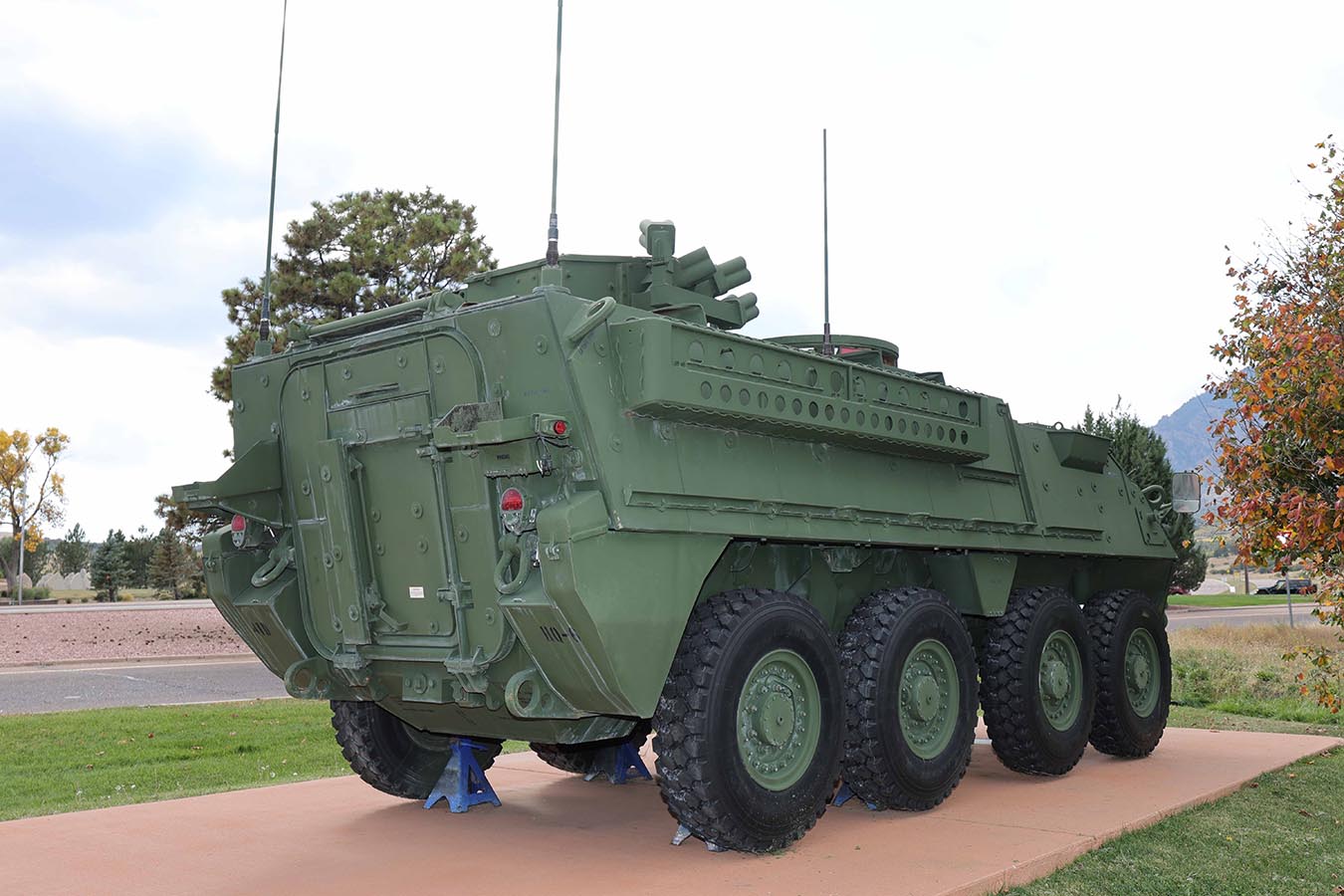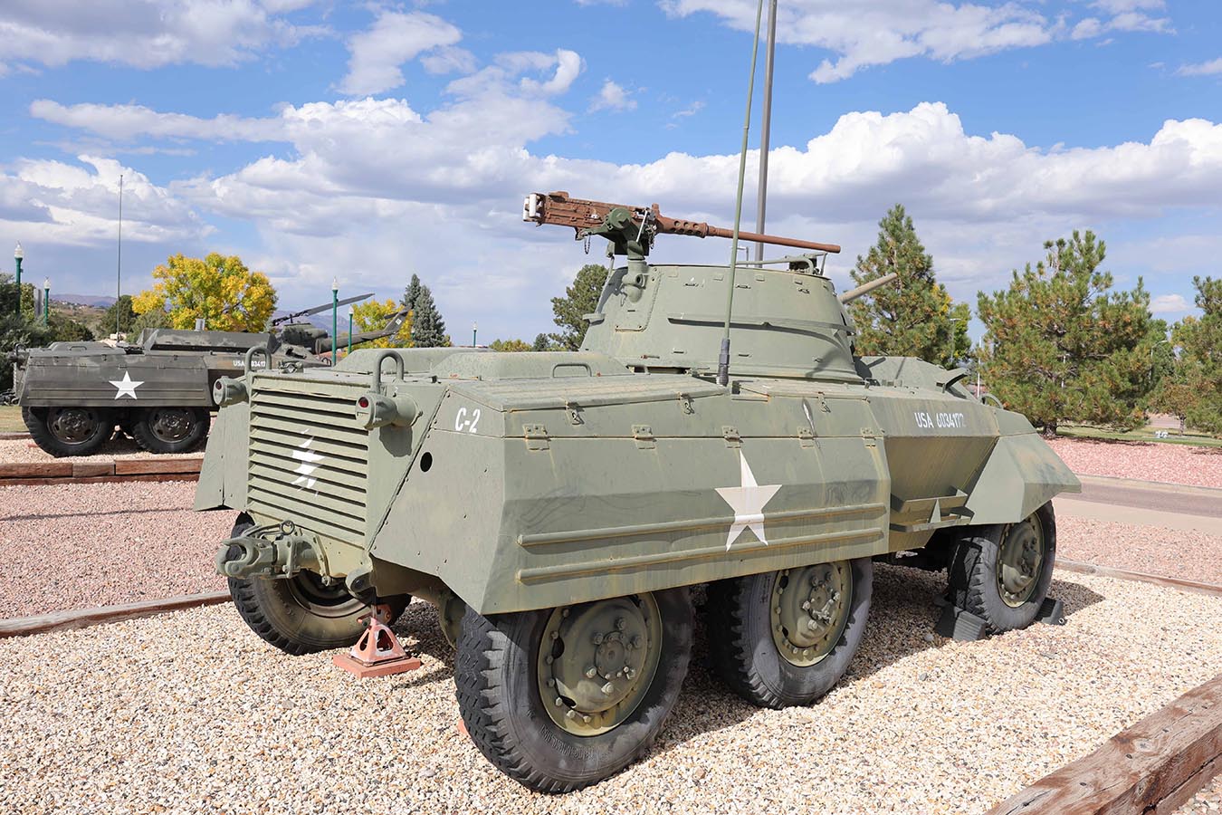 Im US-Bundesstaat Colorado, südlich der Großstadt Denver, liegt Fort Carson. Hier befindet sich das Museum der 4th Infantry Division und Fort Carson Museum. Das Museum war zur Zeit meines Besuches leider geschlossen, aber der großzügige Fahrzeugpark vor dem Museum war den Besuch unbedingt wert. Zum Besuch des Museums und der aufgestellten Fahrzeuge steht ein großer Parkplatz vor der Wache der Kaserne zur Verfügung, sodass hier keine Besonderheiten beim Einlass zu beachten sind. Die gute Luft und der schöne Berghintergrund sind auf jeden Fall ein eigener Genuss. Bei den gratis zu betrachtenden Fahrzeugen handelt es sich um einen M551 Sheridan Luftlandepanzer, die Kampfpanzer M4A3 Sherman (beachtenswert hier die Drehstäbe seitlich der Motorgräting, welche dem Öffnen und Schließen der mit ihrem Unterbau doch recht schweren Klappen dient und die in Europa nur selten zu sehen ist, da diese Nachrüstung erst zum Kriegsende begonnen wurde), M47 (mit einem Schild an der Wannenrückseite, welches auf eine Überholung in Italien hinweist), M60 (auf dem Schild als M48 bezeichnet), M1A1 Abrams und einen russischen T-72, die leichten Panzer M5A1 Stuart, M24 Chaffee und M41 Walker Bulldog, Die Radpanzer M8 und M20 Greyhound, sowie sehr modern einen M1134 Stryker ATGM (Anti Tank Guided Missile) – Panzerjäger. Weiterhin sind noch ein Bradley-Schützenpanzer und ein Bell AH-1 HueyCobra Helikopter zu bewundern.