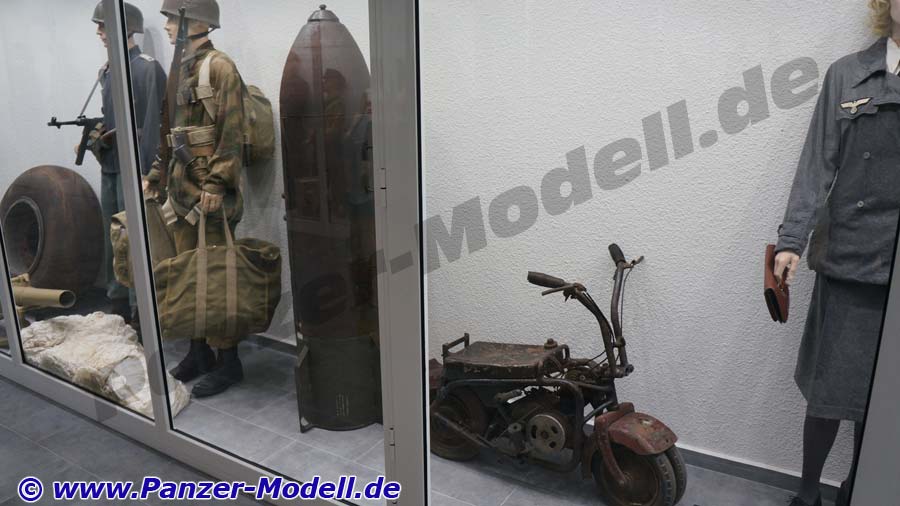 Zusätzlich gibt es eine umfagnreiche Uniformsammlung mit hunderten von Puppen, Handwaffen, Infanteriewaffen, Motoren, einem Panzer II Turm auf Betonsockel und einen Jeep in den man sich zu Fotozwecken reinsetzen darf.
