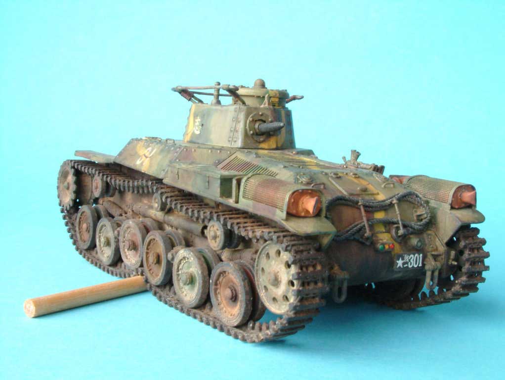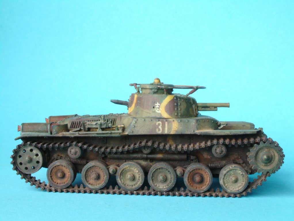 Very well-detailed and original subject. Good camo work but seems washes were a bit strong as the colurs are fuzzy. Weathering is good but too uniform (and attention to the tracks over the terrain!). Nice groundwork, tank and animated figure all contribute to the action.