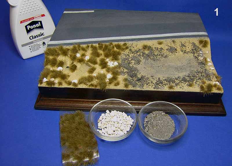 Nachdem nun einige Wochen ins Land gegangen sind hatte jeder interessierte Modellbauer genügend Zeit sich die nötigen Gedanken für den Bau seiner eigenen Vignette zu machen und das nötige Basismaterial sowie die Bausätze zu beschaffen. Im ersten Teil haben wir uns ausgiebig mit der Planung, der Materialbeschaffung und dem grundlegenden Geländebau befasst und werden nun mit der Ausgestaltung der Vignette beginnen. Die Fahrbahn hat ihre Grundfarbe erhalten, der Sandboden im Vordergrund ebenfalls. Für die Darstellung des ausgedörrten Sandbodens mit schwachem Bewuchs verwende ich die bereits erwähnten Karst- und Grasbüschel in unterschiedlichen Farbgebungen aus dem Programm von Silhouette MiniNatur. Kleine Steine stelle ich mittels Katzenstreu dar. Natürlich unbenutzt! Der Boden im Bereich des ausgebrannten Pkw wird mit einfacher Zigarettenasche behandelt. Es hat also auch gewisse Vorteile wenn man Raucher ist...