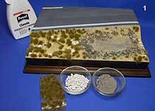 Ok, los geht's! Die Karstbüschel werden geliefert in kleinen Blisterpackungen. Darin findet sich eine Folie mit einzeln aufgeklebten Büscheln. Diese zieht man einfach ab und verklebt sie mit einem Tropfen Holzleim an der gewünschten Position auf der Vignette. Hierbei kann man die unterschiedlich eingefärbten Büschel aus mehreren Packungen miteinander mischen und erhält so schon einen gewissen "natürlichen" Bodenbewuchs. Variiert man noch die Abstände zwischen den einzelnen Büscheln und achtet auf eine gesunde Mischung von kleinen und etwas größeren Gräsern so wirkt das Ergebnis sogar schon ohne zusätzliche Farbbehandlung sehr realistisch. Ergänzt wird der Bereich jetzt noch durch die Katzenstreu-Steine, die ebenfalls mit Holzleim verklebt werden. Um den Pkw wird der gesamte Boden nun mit der Zigarettenasche und einem großen weichen Pinsel behandelt. Die Asche wird regelrecht auf den Boden aufmassiert und dadurch entsteht schon der erste Eindruck von Rußbildung, verbranntem Boden und Asche. Siehe Bild 1.