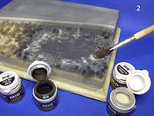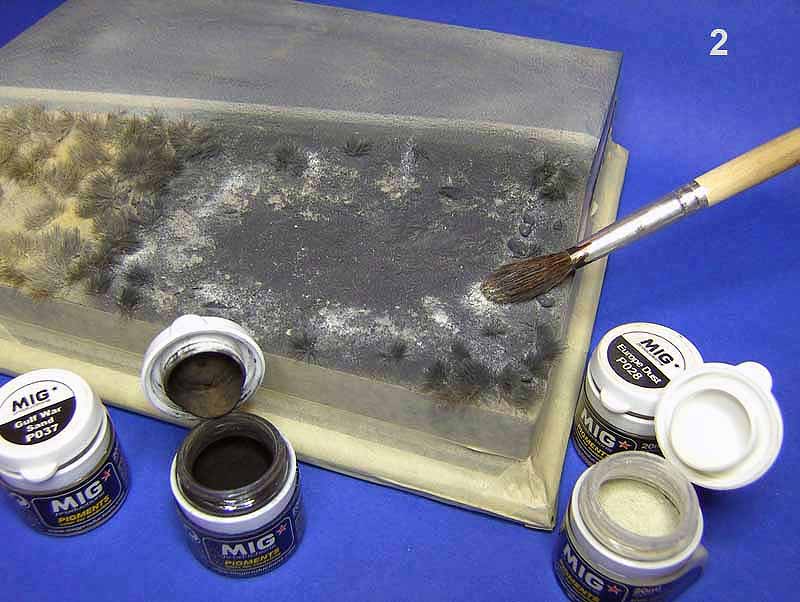 Für die Darstellung der Asche im Brandbereich verwendete ich Pigmente von MIG Productions. Allerdings nahm ich nicht White Ashes P022 sondern entschied mich für Concrete P026. Das ist ein sehr heller Grauton, der nicht so extrem hellweiß leuchtend wirkt wie das White Ashes. Vorsichtig trug ich die "Asche" nun wieder mit einem weichen Rundpinsel auf und massierte die Pigmente in den rauen Untergrund. Siehe Bild 2.