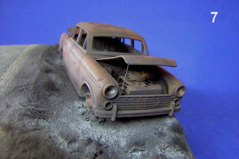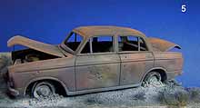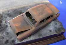 Obwohl es sich bei dem Pkw ja nur um das sogenannte "secondary vehicle" handelt habe ich ihn so sorgfältig wie den Hauptakteur der Szene, den T-55, gebaut und in einigen Bereichen nachdetailliert. Er wurde auf dem Boden aufgesetzt und an den Felgen jeweils mit Holzleim am Untergrund befestigt. Um die Felgen brachte ich ein wenig Holzspachtel an den ich grob und unregelmäßig platzierte. Dadurch sollen später die Reste der verbrannten Reifen simuliert werden, einige dünne Kupferdrähte stellen die Stahleinlagen aus den Reifen dar. Sie wurden mittels Sekundenkleber auf die Felgen geklebt. Anschließend färbte ich alles in dem Bereich mit den bereits vorher verwendeten Pigmenten ein und schaffte dadurch den Übergang zum Boden. Siehe Bilder 4 und 5.