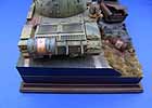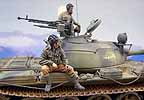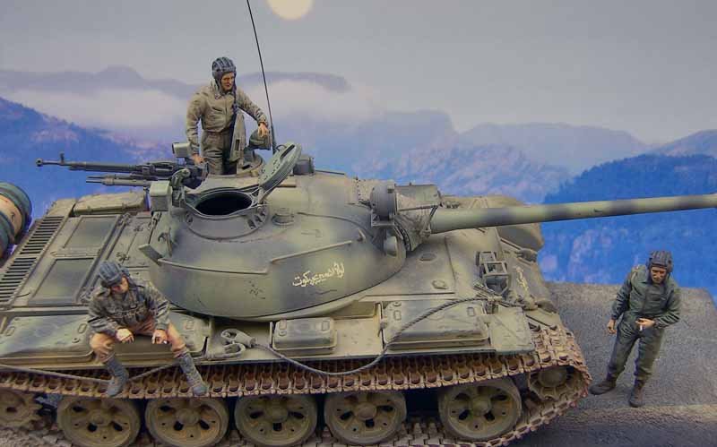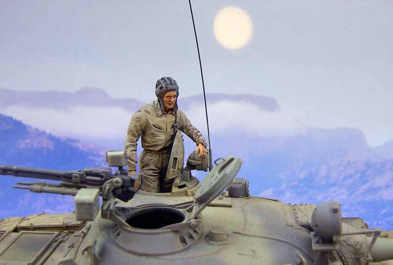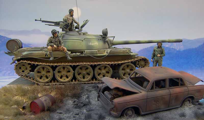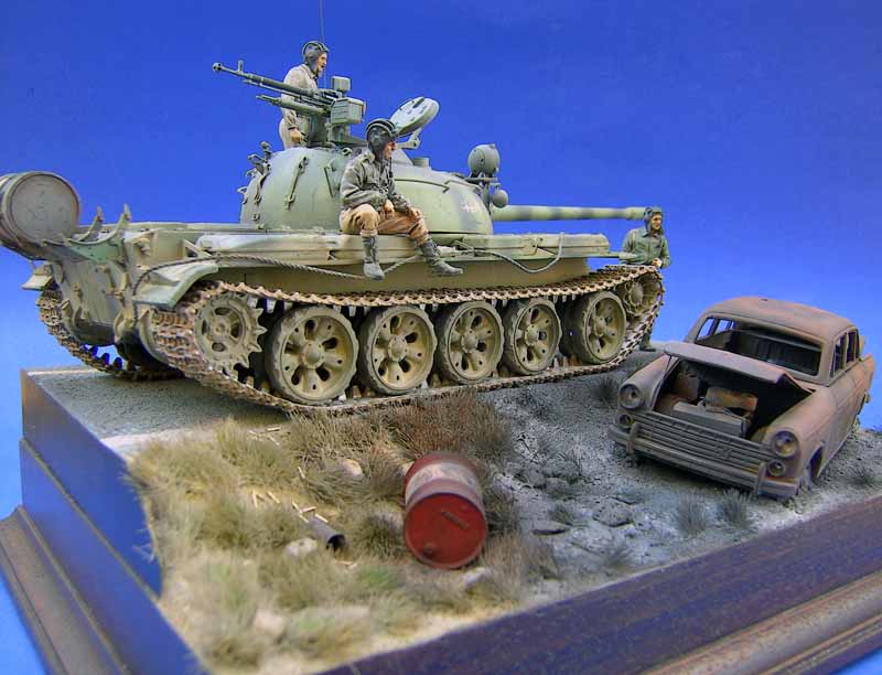 Das Kernstück unseres Dioramas, der T-55 mit den drei Soldaten, steht zwar im Hintergrund, ist aber dennoch gut zu sehen durch die erhöhte Position. Gleichzeitig bildet er den Abschluss der Base nach hinten. Die drei Soldaten habe ich gezielt zueinander ausgerichtet, sie blicken alle auf den Pkw. Dadurch werden sie optisch zu einer Einheit, obwohl sie ein wenig voneinander entfernt platziert sind. Der Zusammenhang von Panzer, Soldaten und Pkw ist für den Betrachter zu erkennen. Die Szene erklärt sich von selbst.