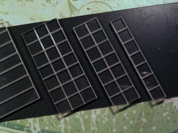 Die so verspiegelten Plexigläser nun VORSICHTIG in einzelne, etwa 6,5 mm lange Blöcke rechtwinklig trennen. Diese Sichtblöcke jetzt an den neuen Schnittstellen bis auf 5,4 mm bei vollverkleideter (5,8 mm, wenn Teil Verkleidung gewünscht wird) Variante planfräsen/-schleifen (dabei Parallelität und rechten Winkel beachten). Auch dabei sehr vorsichtig hantieren, damit die Klebeverbindungen nicht beschädigt werden.